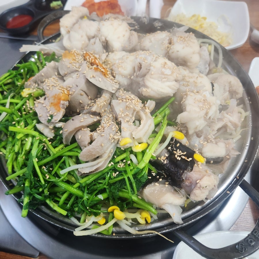 한쪽에는 초록빛 미나리와 콩나물이 푸짐하게 깔려 있어 아삭한 식감을 예고했고, 가운데에는 귀하디귀한 아귀 간과 대창이 함께 올라가 담백함과 고소함의 균형이 완벽하게 잡힌 구성이었습니다.